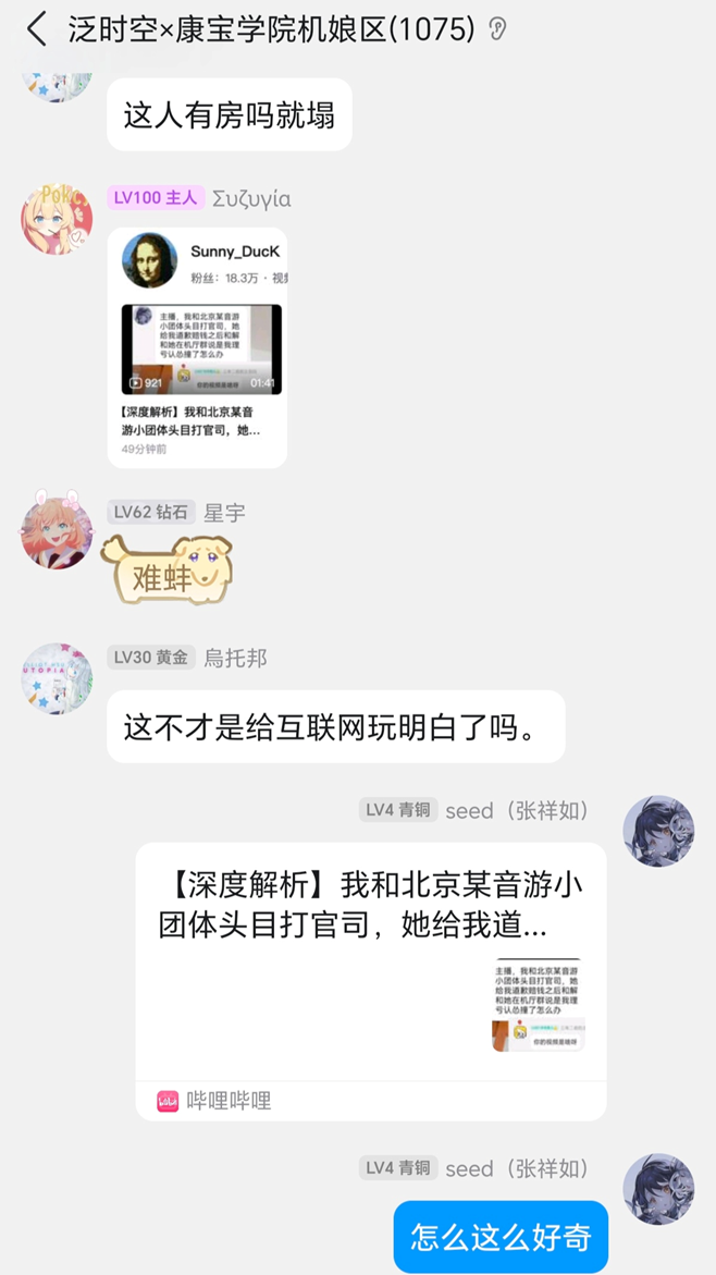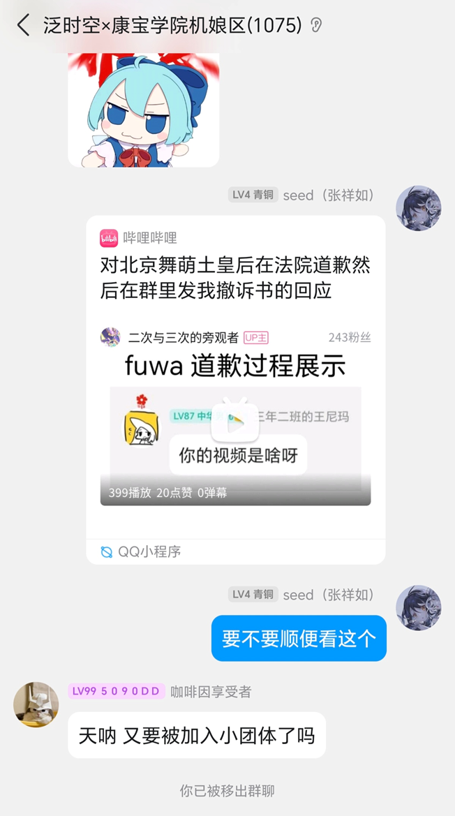 1、泛时空群群员把 sunny_duck 锐评的视频封面发到群内,于是我分享了原视频和 fuwa 的道歉视频。结果馒头马上破防,瞬间暴政。